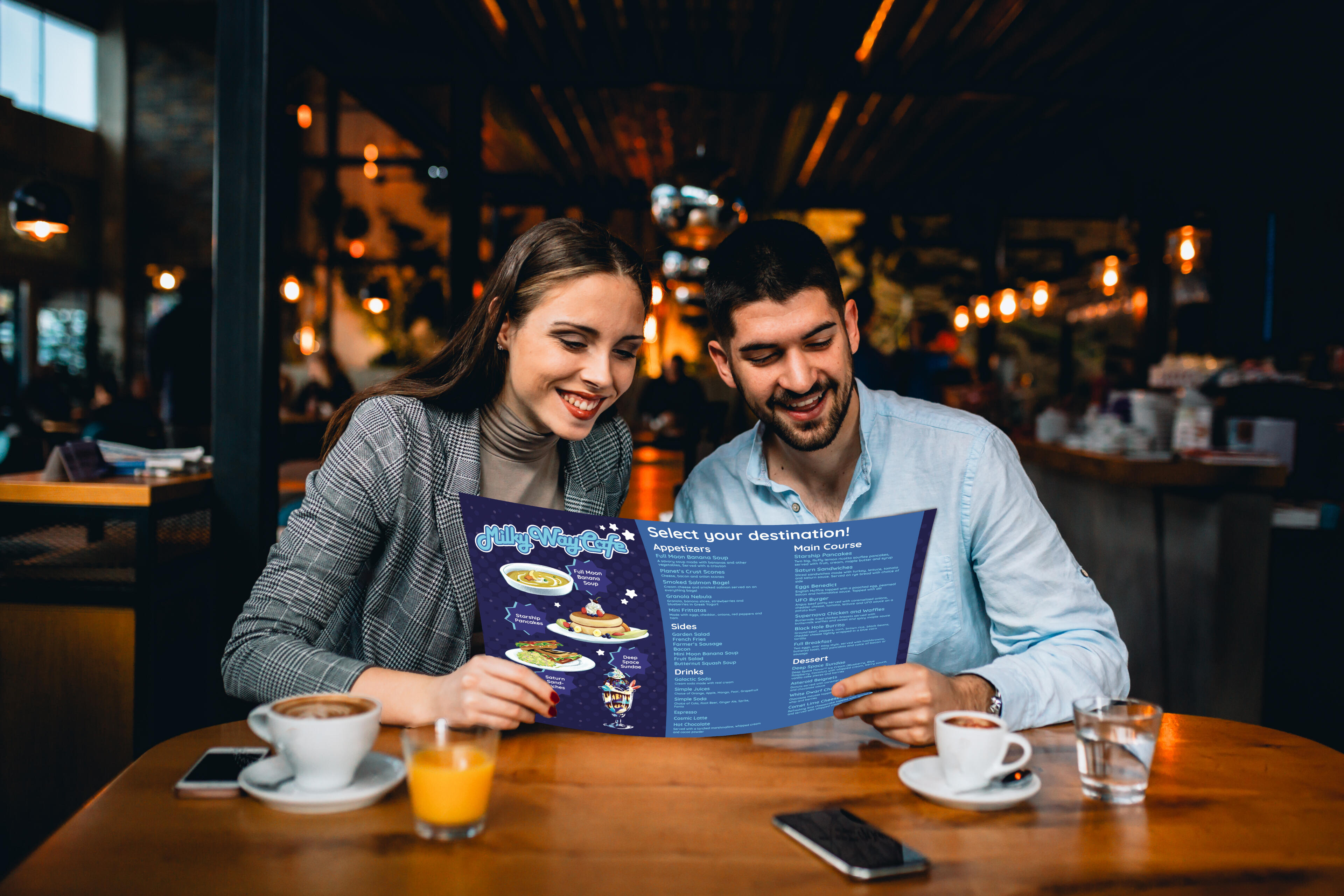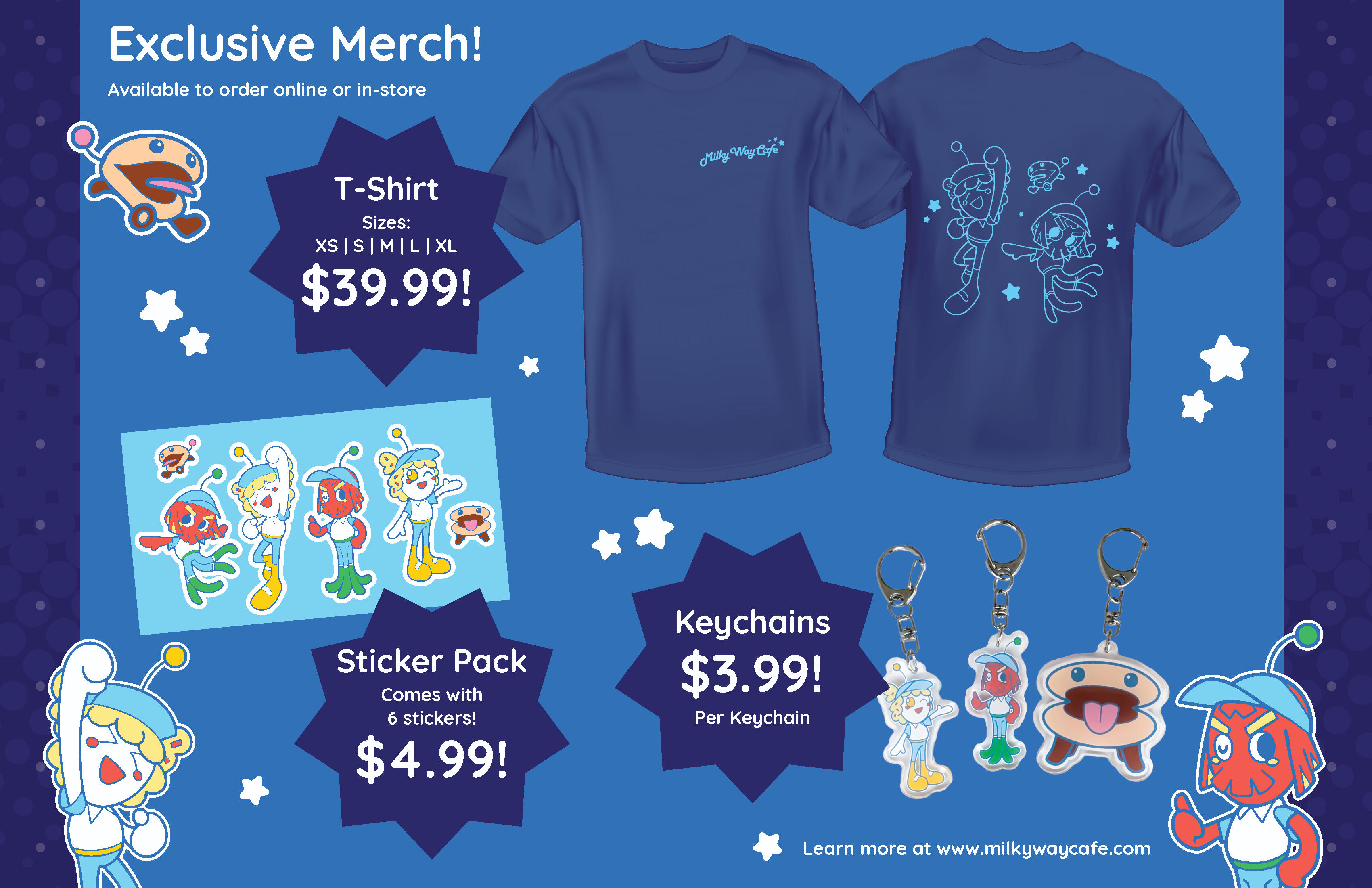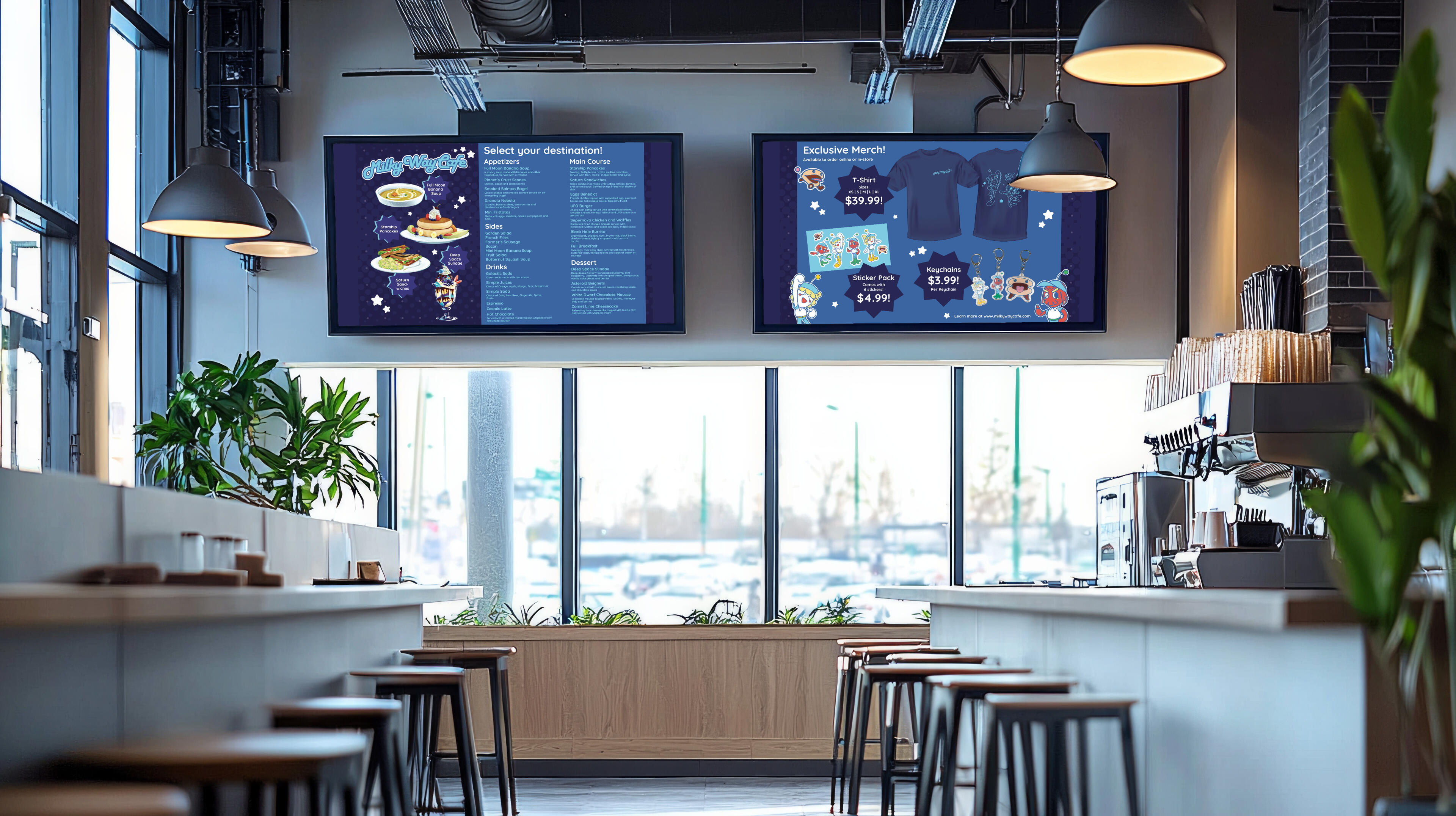 4th Year Thesis Project. Marketing Material for a fictional restaurant themed around space and aliens. Consists of a hero image, logo designs, mascot designs, a menu mockup, merchandise mockups and physical keychains, and a mural mockup.