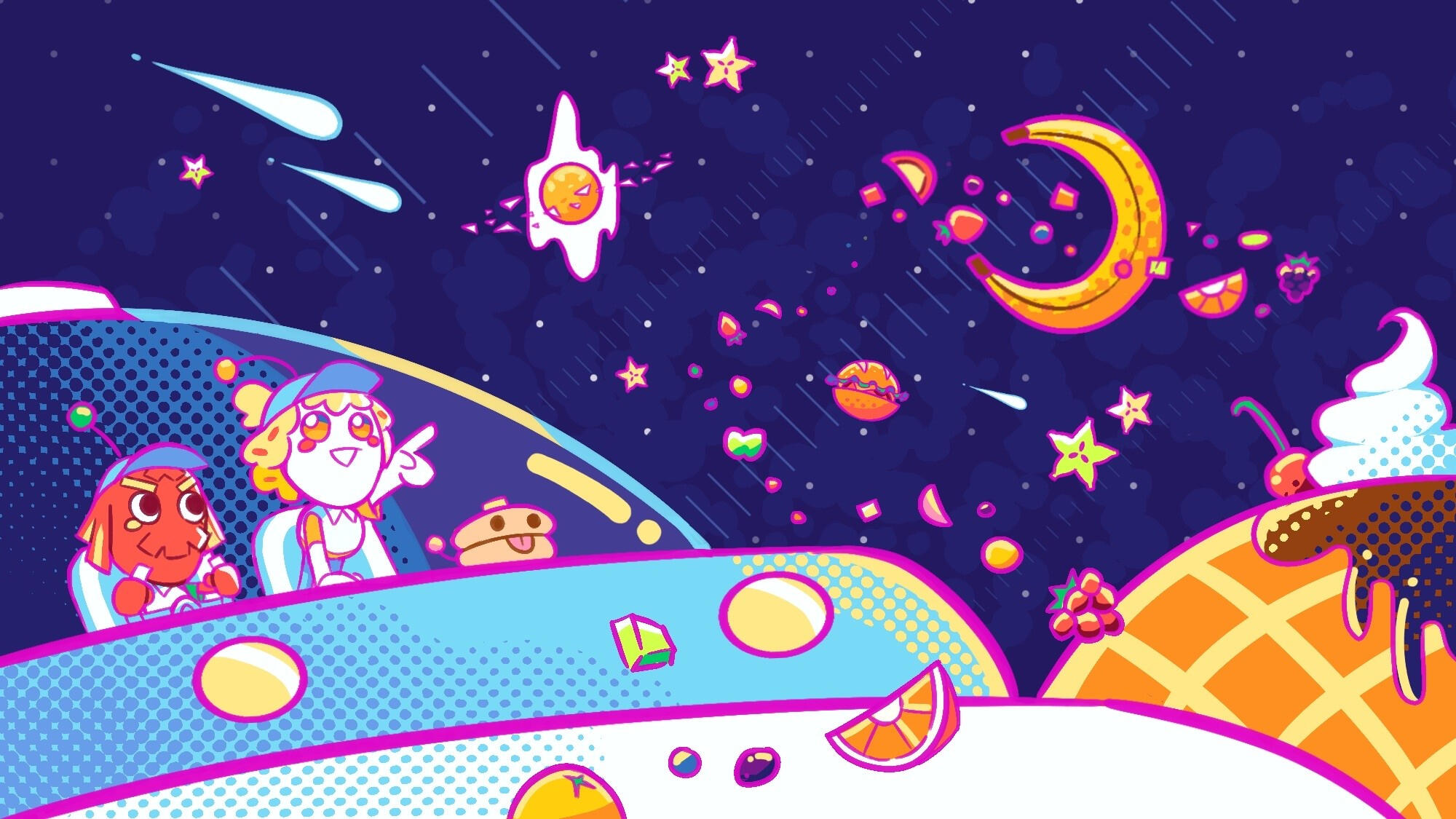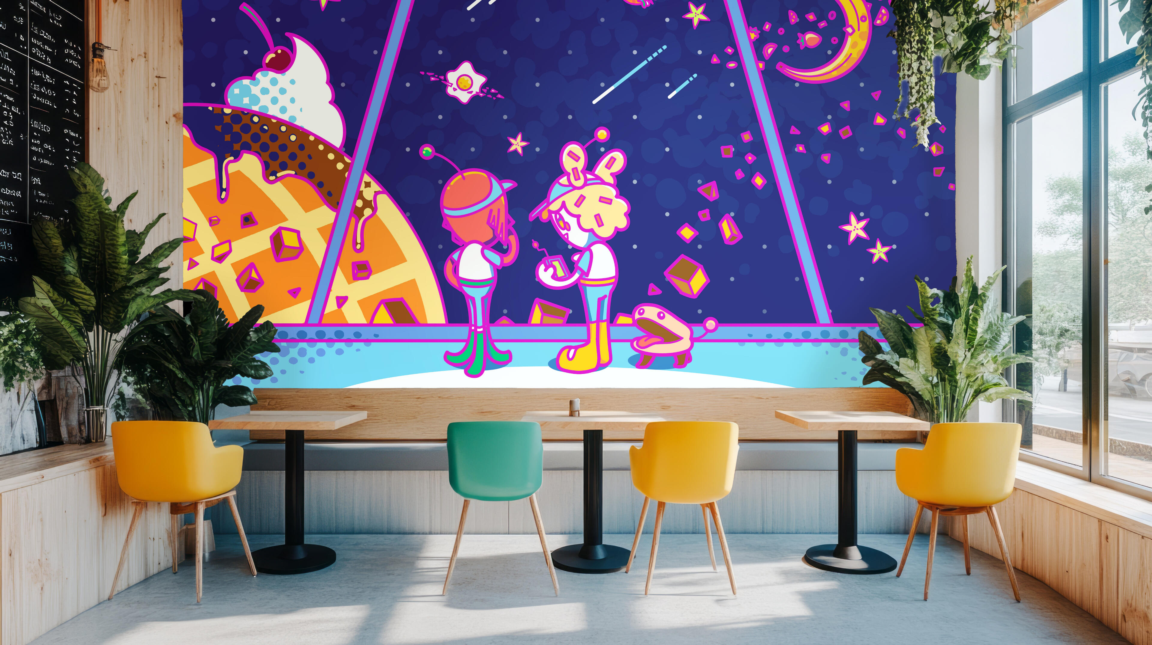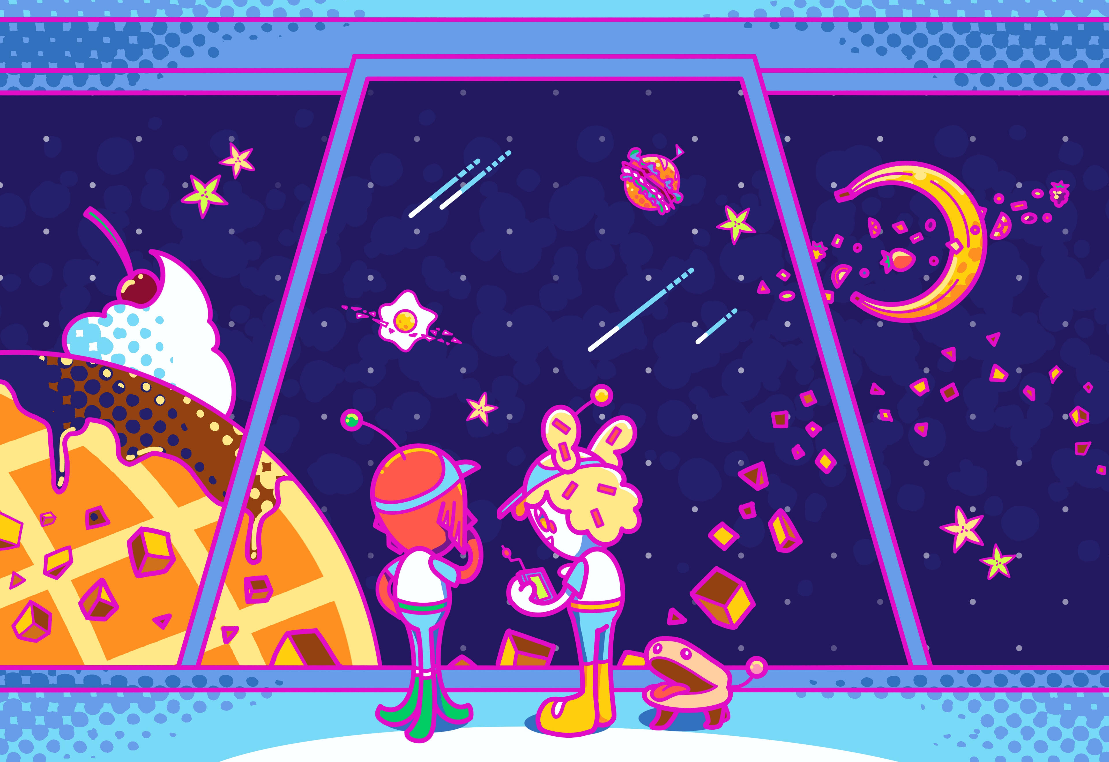 4th Year Thesis Project. Marketing Material for a fictional restaurant themed around space and aliens. Consists of a hero image, logo designs, mascot designs, a menu mockup, merchandise mockups and physical keychains, and a mural mockup.